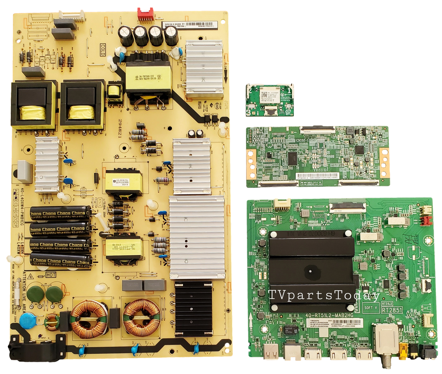 75S434 TCL TV Repair Parts kit, 08-RT51L06-MA200AA Main Board, 08-L40XWA4-PW210AA Power Supply, 4T-TCN750-CS09 T-Con, 07-7668L2-MA0G Wifi, 75S434